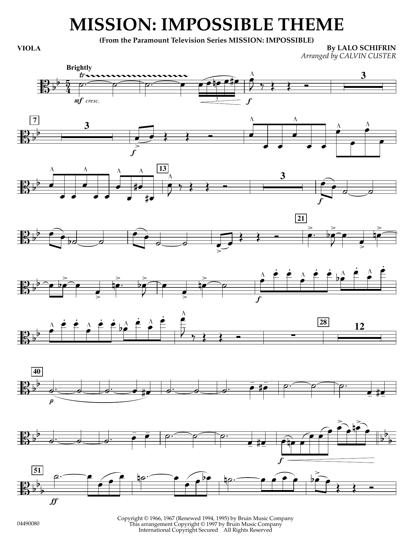 Noten der Titelmusik aus dem Film 'Mission: Impossible' für Sinfonieorchester, komponiert von Lalo Schifrin, arrangiert von Calvin Custer.
