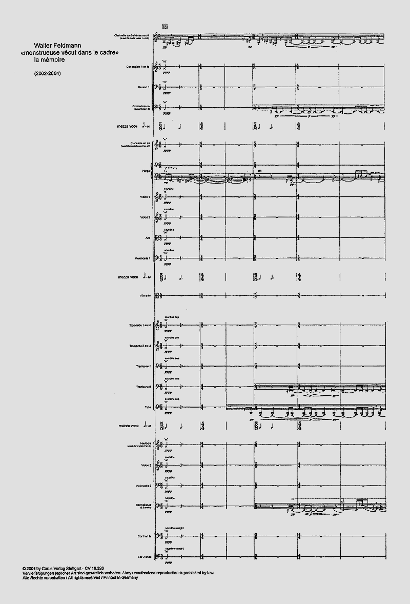 Va solo, large ensemble in 6 groups: 1) Kontrabassclt/Bclt; 2) 2 Cor; 3) EH, Fg, Fg/Cfg; 4) Ob/EH, Vl, Vc, Cb; 5) 2 Tr, 2 Trb, Tuba; 6) Clt/Bclt, Arpe, 2 Vl, Va, Vc