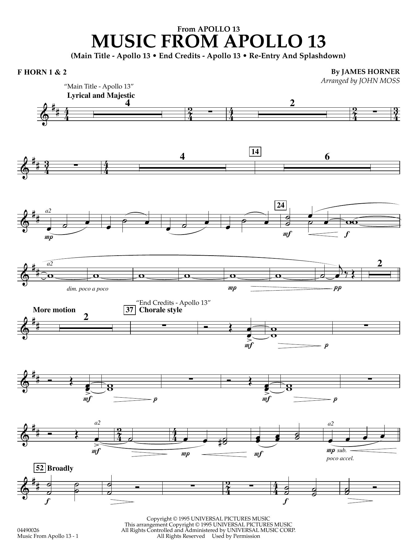 Nominated for a Grammy award, this film score played a key role in the emotion and drama of the blockbuster movie 'Apollo 13. ' This medley, skillfully crafted by John Moss, opens with the plaintive solo trumpet them and includes much of the film's memorable and inspiring music. This iS good, solid repertoire for mature orchestras, and at the same time it iSplayable by developing orchestras looking to expand their repertoire. Very dramatic music!