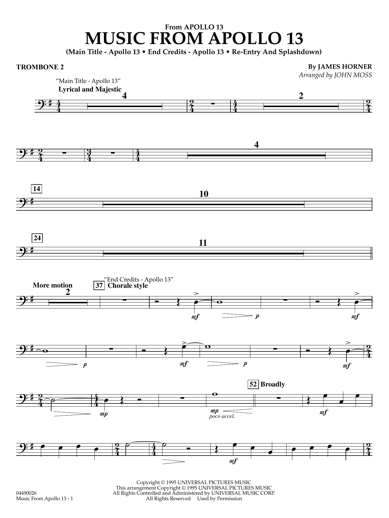 Nominated for a Grammy award, this film score played a key role in the emotion and drama of the blockbuster movie 'Apollo 13. ' This medley, skillfully crafted by John Moss, opens with the plaintive solo trumpet them and includes much of the film's memorable and inspiring music. This iS good, solid repertoire for mature orchestras, and at the same time it iSplayable by developing orchestras looking to expand their repertoire. Very dramatic music!
