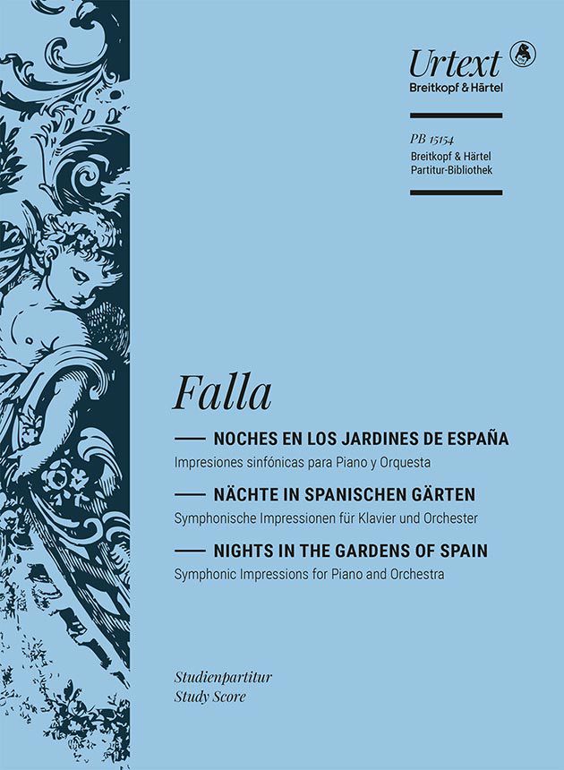 Entstanden während seines langjährigen Aufenthalts in Paris, sind diese drei symphonischen Impressionen für Klavier und Orchester von Manuel de Falla ein expressives Werk, das die südspanischen Gärten, die in europäischer und arabisch-maurischer Tradition angelegt sind, musikalisch zum Leben erweckt. Der Einfluss der zeitgenössischen französischen Musik ist in dieser Komposition spürbar. Trotz vieler Umarbeitungen, u.a. in Hinblick auf Besetzung, Anzahl der Sätze sowie Anlage und inhaltliche Konzeption, war die Grundidee einer nächtlichen Impression von Anfang an erhalten. Das Werk wurde erst kurz vor der Uraufführung fertig und damit auch das Orchestermaterial. Die Aufführung war ein großer Erfolg. Der Krieg verhinderte vorerst eine Drucklegung, doch folgten weitere Aufführungen, bei denen dann aus handschriftlichem Material gespielt wurde. Die von Ullrich Scheideler vorgelegte Urtext-Ausgabe nimmt die Erstausgabe der Partitur als Hauptquelle. Der Kritische Bericht informiert ausführlich über die Quellenlage.