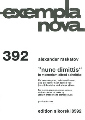 Einige Jahre nach Alfred Schnittkes Tod beauftragte dessen Witwe Irina den Kom-ponisten Alexander Raskatov mit der Rekonstruktion der 9. Sinfonie ihres Man-nes, der das Werk am Ende seines Lebens, inzwischen rechtsseitig gelähmt, nur mit Mühe in zitternder, schwer lesbarer Schrift hatte zu Papier bringen können. Während seiner Arbeit entwickelte Raskatov die Idee, Schnittkes Sinfonie eine eigenständige Komposition als Epilog hinzuzufügen. Das vokalsinfonische Werk, in dem er Texte von Joseph Brodsky und des orthodoxen Mönchs Starez Siluan vertonte, betitelte er 'Nunc dimittis'. Der entsprechende Passus, in vollständigem Wortlaut 'Nunc dimittis servum tuum, Domine', ist dem Lobgesang des Simeon aus dem Lukasevangelium (Lukas 2, 29-30) entnommen und bezieht sich mit den Worten 'Nun entlässest du, Herr, deinen Knecht' auf den greisen Simeon, der kurz vor seinem Tod dem Jesuskind begegnet und erst dann in Frieden sterben kann. Diese Szenerie ist auch die Vorlage für Brodskys Gedicht. Von Irina Schnittke habe er erfahren, sagt Raskatov, dass Joseph Brodsky der Lieblingsdichter von Alfred Schnittke in dessen letzten Lebensjahren gewesen sei. Die Verbindung mit dem Gebet des russischen Heiligen Starez Siluan wiederum sei für Raskatov na-he liegend gewesen, da 'beide Texte mit der Idee des 'Abschieds' im Einklang stehen'; das Gefühl, Abschied zu nehmen, habe Alfred Schnittke auch bei der Arbeit an seiner letzten Sinfonie begleitet. 'Nunc dimittis' wurde am 16. Juni 2007 in der Dresdner Frauenkirche von der Mezzosopranistin Elena Vassilieva, dem Hilliard Ensemble und der Dresdner Philharmonie unter der Leitung von Dennis Russell Davies zusammen mit Schnittkes 9. Sinfonie uraufgeführt. --------------------------------------------------------- Several years after Alfred Schnittke's death, his widow Irina commissioned the composer Alexander Raskatov to reconstruct the Ninth Symphony of her husband, who, at the end of his life and paralysed on his right side by then, had only been able to write down the work in a shaky and poorly legible hand. During his work Raskatov developed the idea of adding a new composition of his own as an epilogue to Schnittke's Symphony. He entitled the vocal-symphonic work 'Nunc dimittis,' in which he set texts by Joseph Brodsky and the Orthodox monk Starets Siluan. The corresponding passage, which reads 'Nunc dimittis servum tuum, Domine' in full, is taken from Simeon's song of praise in the Gospel of Luke (2:29-30). There it relates to the aged Simeon, who shortly before his death meets the Christ Child and, with the words 'Lord, now dost thou let thy servant depart,' is finally able to die in peace. This is also the scenery that Brodsky's poem refers to. As Raskatov recounts, he learned from Irina Schnittke that Joseph Brodsky had been Alfred Schnittke's favourite poet in the last years of his life. The combination with the prayer by the Russian holy man Starets Siluan seemed natural, Raskatov continues, since 'both texts are exactly in tune with the idea of 'farewell'; the feeling of bidding farewell also accompanied Alfred Schnittke during the work on his last symphony. Along with Schnittke's Ninth Symphony, the premiere of 'Nunc dimittis' was given on 16 June 2007 at Dresden's Frauenkirche by Elena Vassilieva, mezzo-soprano, the Hilliard Ensemble and the Dresdner Philharmonie conducted by Dennis Russell Davies.