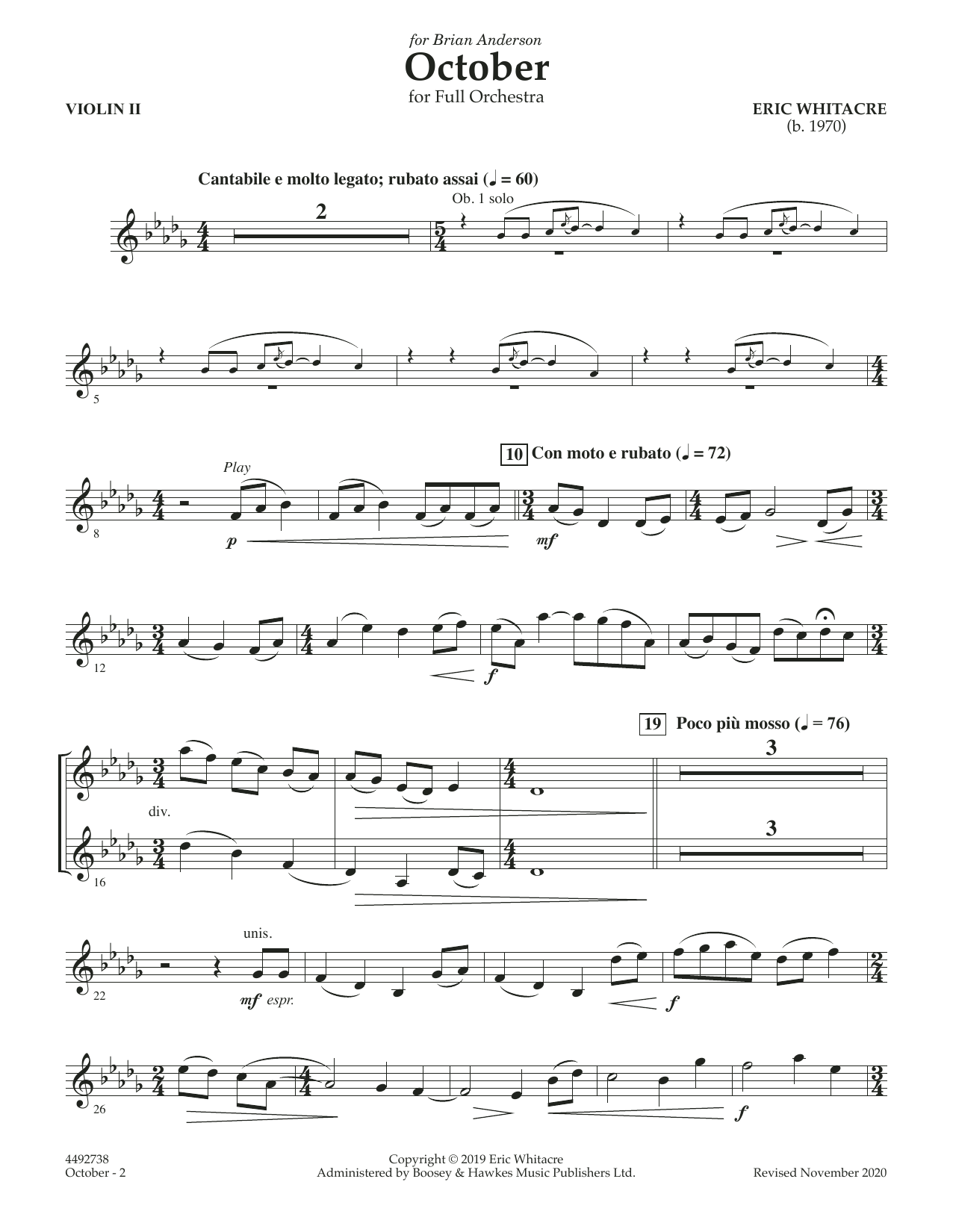 The continuing popularity of Eric Whitacre's dramatic and evocative music is evident in concert programming everywhere, with his symphonic, choral, and operatic works. October is arguably his most notable symphonic work, now adapted in this stunning version for full orchestra.