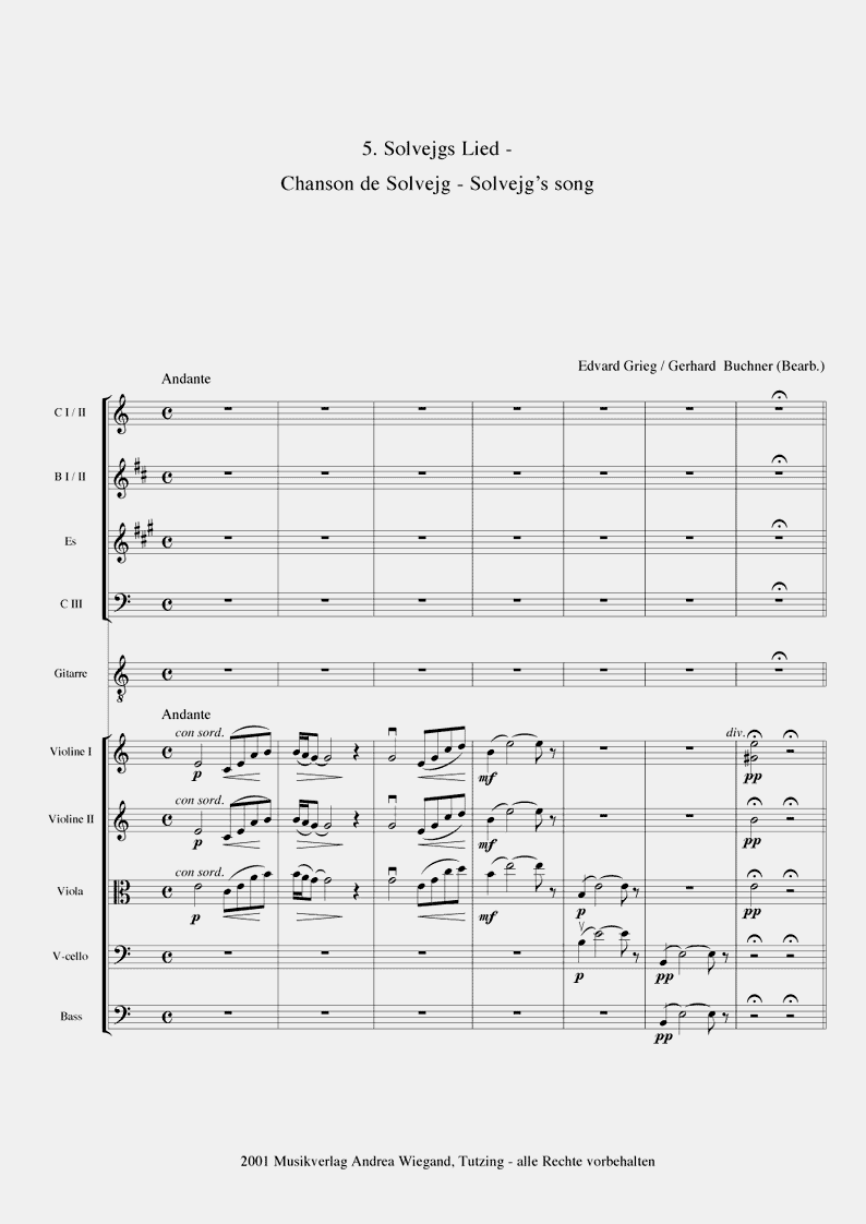 Die Bearbeitung ist aus der Schauspielmusik entwickelt. Sie umfasst die beliebten, von Edvard Grieg selbst für seine Suiten ausgewählten Sätze, ergänzt durch die Einleitungsmusik Das Hochzeitsfest und das zauberhaft schlichte Solvejgs Wiegenlied.