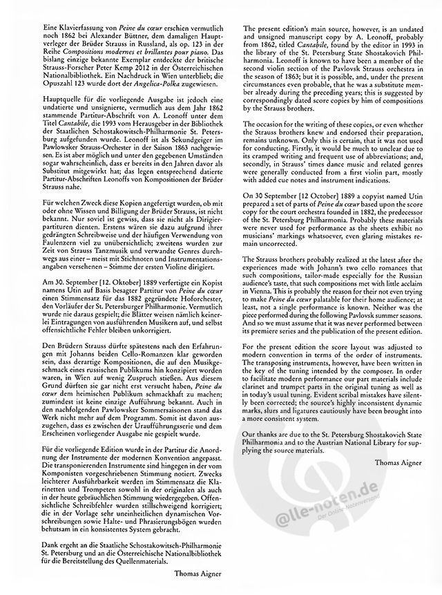 Josef Strauss hat dieses Werk für das Pawlowsker Publikum geschrieben. Das Stück weist ein lyrisches Horn-Solo auf, neuartig ist auch die reiche Chromatik einzelner Passagen des Werkes. Hauptquelle für die Ausgabe ist eine undatierte und unsignierte Abschrift aus 1862, die vom Herausgeber in der Bibliothek der Staatlichen Schostakowitsch-Philharmonie St. Petersburg 1993 aufgefunden wurde. (nach d. Vorw. d. Hg.)