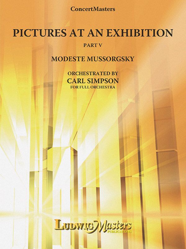 Diese Orchestrierung, die vollständig original ist, basiert hauptsächlich auf dem autographen Manuskript. Im Einklang mit dem Zweck der ConcertMasters-Orchesterreihe wurde die Orchestergröße klein gehalten. Die einzigen Abweichungen von Mussorgskys Originalpartitur sind die Transposition des gesamten Werks um eine ganze Stufe nach oben, die Vereinfachung einer 16tel-Sextolen-Begleitung in "Die Hütte auf Hühnerbeinen" und das selektive Weglassen der "attacca"-Angaben, die sich am Ende jedes Promenadenteils befinden. Sätze: 15. Die Hütte auf den Hühnerbeinen (Baba-Yaga) 16. Das Rittertor in der alten Hauptstadt Kiew (Das große Tor von Kiew). Instrumentation: 2+Picc.2.2+BCl.2: 4.3.3.1: Timp.Perc)4): Str(9-8-7-6-5).