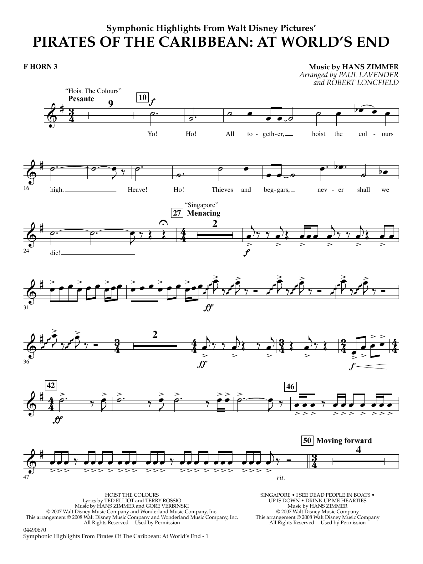 With some brilliant new themes along with familar strains from the first two films, this third and final chapter promises to be the best yet. Hans Zimmer's powerful musical backdrop sets the adventure level at an all-time high for those orchestras who love to play film music. Includes: Hoist the Colors, Drink Up Me Hearties, I See Dead People in Boats, and Up Is Down.