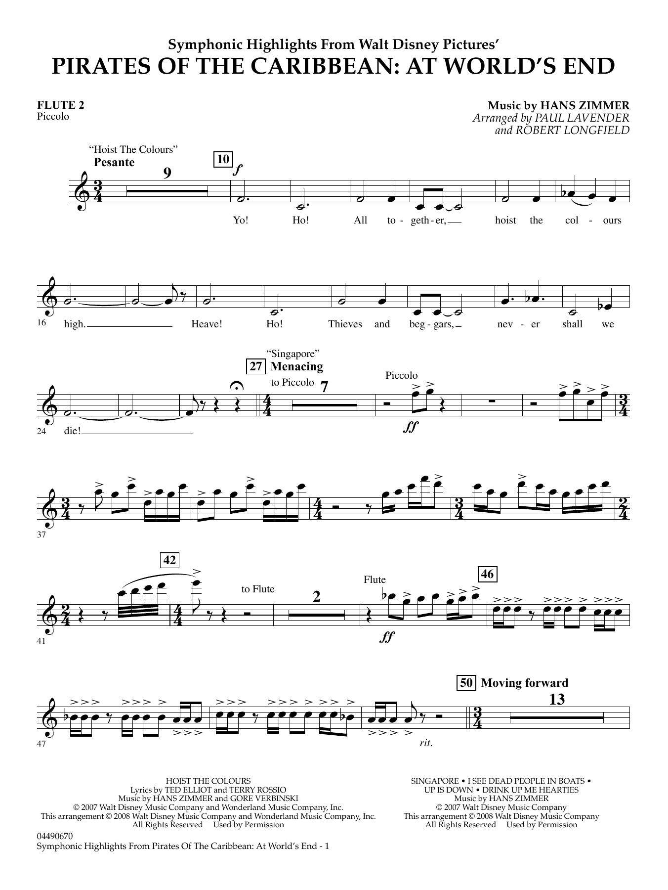 With some brilliant new themes along with familar strains from the first two films, this third and final chapter promises to be the best yet. Hans Zimmer's powerful musical backdrop sets the adventure level at an all-time high for those orchestras who love to play film music. Includes: Hoist the Colors, Drink Up Me Hearties, I See Dead People in Boats, and Up Is Down.