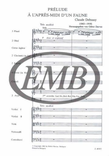 Debussy decided in 1892, at the age of thirty, to compose a work for orchestra after Mallarmé's poem, L'aprés-midi d'un faune. Originally he had thought of writing three movements (Prélude - Interlude - Paraphrase) but when the first movement was completed in September 1894 he came to the conclusion that the continuation would be superfluous. The Prélude was first performed in Paris with Gustave Doret as conductor on 22 December of the same year yet, as it achieved immediate succes it had to be repeated. Source for the present edition was the first printed score (1895) which had been revised by the composer. Debussy's original, French expressions and markings have been retained.