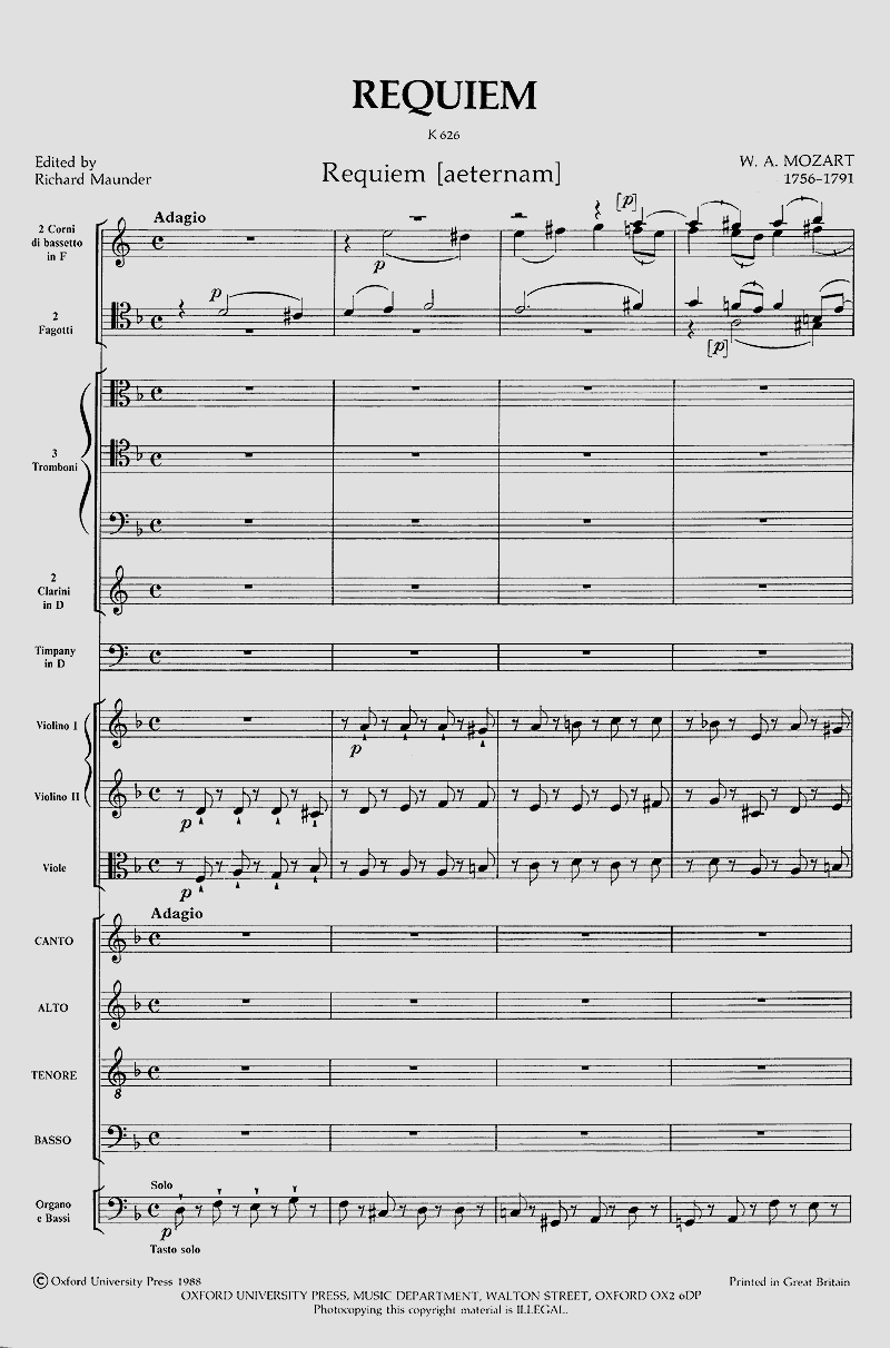 Soli SATB, Coro SATB, 2 Fg, 2 Ctr, 3 Trb, 2 Bassetthörner, Timp, 2 Vl, Va, Vc/Cb, Org (Fassung Maunder)