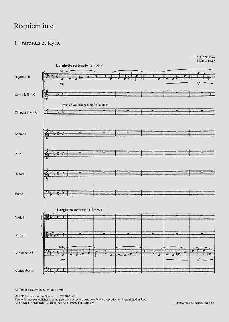 Cherubinis c-Moll-Requiem für gemischten Chor (ohne Vokalsolisten) und Orchester, das hier in einer kritisch-korrekten Neuausgabe vorliegt, zählt zu den bedeutendsten Beiträgen des Genres im 19. Jahrhundert. Es entstand 1816 in Paris und erlangte binnen kurzer Zeit einen hohen Bekanntheitsgrad. Musiker wie Beethoven, Schumann und Brahms haben es ausserordentlich geschätzt aufgrund seiner satztechnischen Souveränität, Instrumentationskunst, Formbeherrschung und seines ausgewogenen Wort-Ton-Verhältnisses. - Coro SATB, 2 Ob, 2 Clt, 2 Fg, 2 Cor, 2 Tr, 3 Trb, Timp, Tamtam, 2 Vl, 2 Va, Vc, Cb