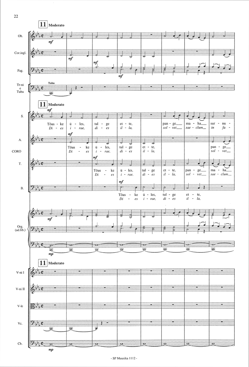 Coro SATB, 2 Fl, 2 Ob, 2 Cl, 2 Fg, 4 Cor, 2 Tr, 3 Trb, Tb, 2 Vl, Va, Vc, Cb, [Org]