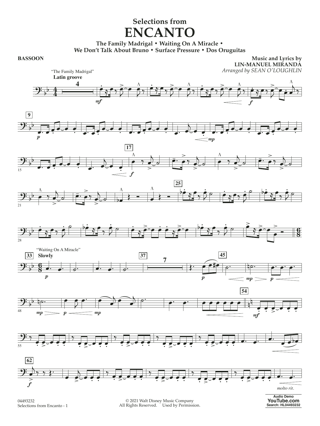 Das unwiderstehliche Latin-Flair und die Hits aus dem erfolgreichen Disney-Film sind in diesem brillanten Medley für volles Orchester meisterhaft eingefangen. Mit den Hits "The Family Madrigal", "Waiting on a Miracle", "We Don't Talk About Bruno", "Surface Pressure" und "Dos Orguitas" wird dieses Werk ein Favorit für Musiker und Konzertbesucher sein.