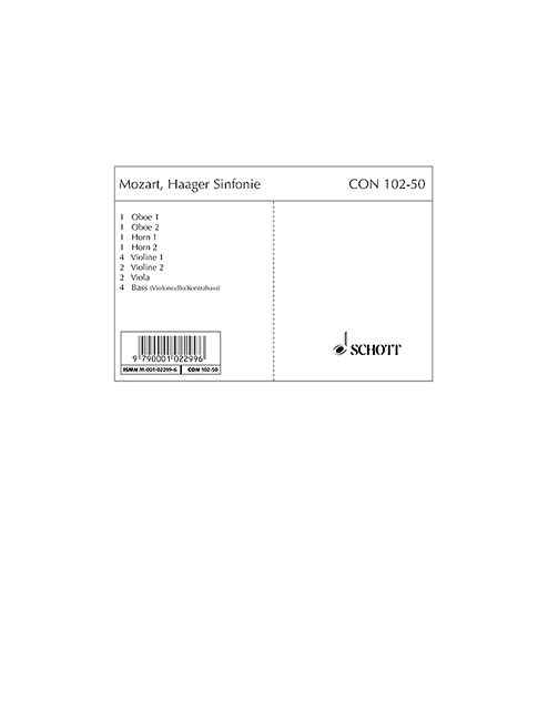 Oboe I/II, Horn-b I/II, 4 Violinen I/II, 2 Violen, 4 Violoncelli/Kontrabässe. In dieser kleinen dreisätzigen Sinfonie, die Mozart mit zehn Jahren schrieb, wird im Finale erstmals die Rondoform verwendet. Auch dieses Werk ist - wie die Lambacher Sinfonie G-Dur - ohne Bläser, als reine Streichersinfonie, spielbar. Im zweiten Satz müssen dann zwei Solo-Vio-linen stellenweise die Oboen-Partien übernehmen.