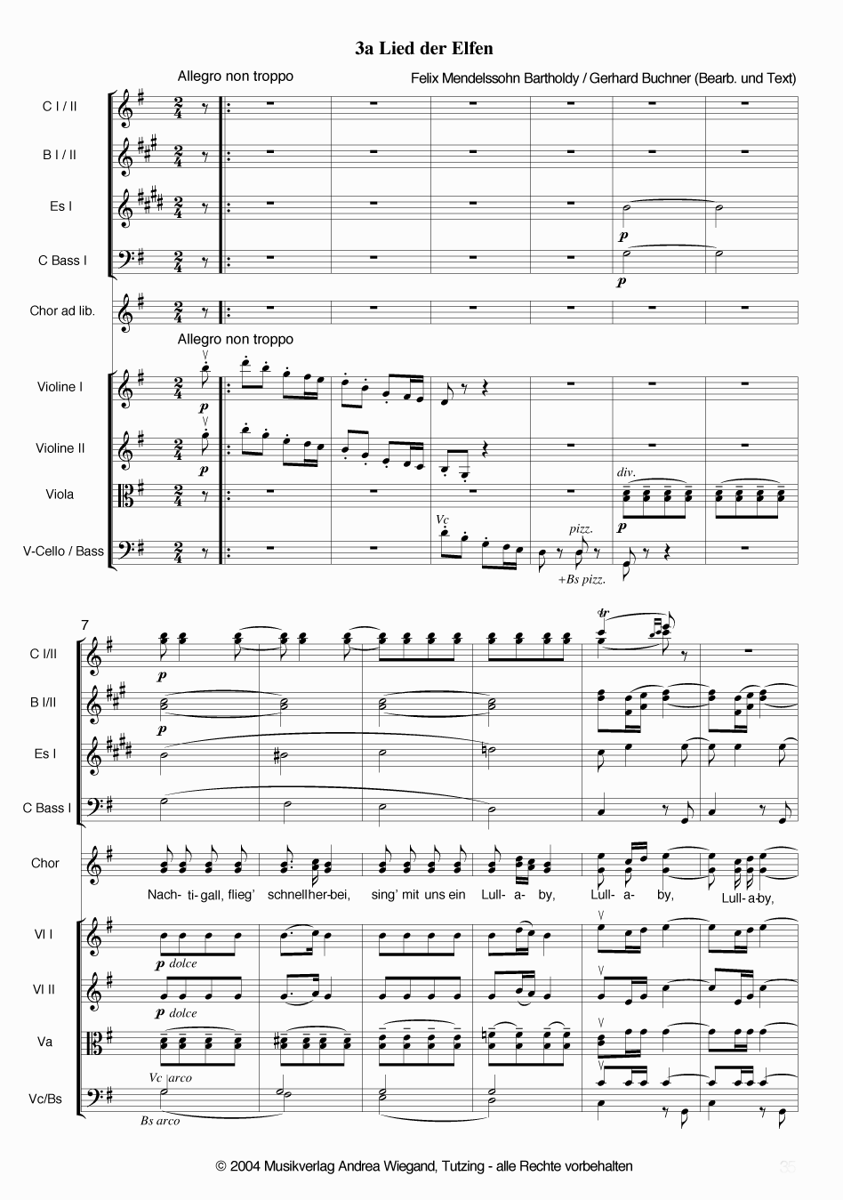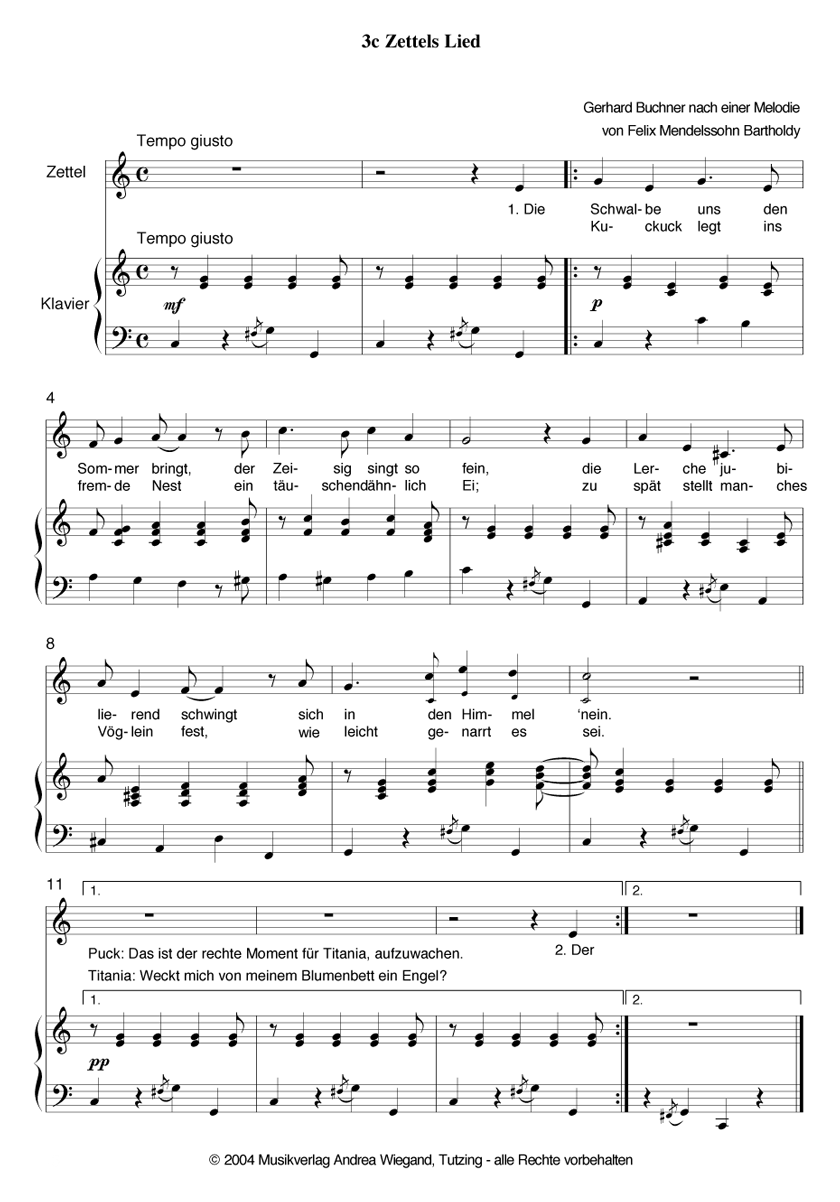 Acht verschiedene Bläser bringen ad lib. zusätzliche Farben. Neben zwei Flöten, einer Klarinette, einer Trompete (oder zweiter Klarinette) sind zwei Altsaxophone bzw. Hörner sowie zwei Bassinstrumente (alternativ Posaune, Fagott, Tuba) vorgesehen. Nicht alle Bläser müssen besetzt werden, weil durch die Streicher jederzeit das harmonische und melodische Gerüst erhalten bleibt.Der Klavierauszug macht jedem einigermassen geübten Pianisten viel Vergnügen, zumal er Zettels Lied in der Aufführung allein begleiten darf. Das Elfenlied kann rein instrumental oder mit einem Chor (Sopran und Alt) vorgetragen werden.