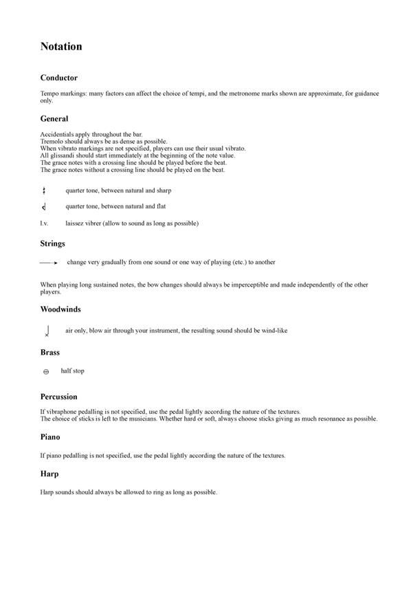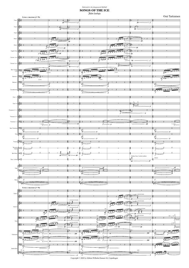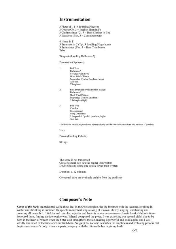 Songs of the Ice is an orchestral work about ice. In the Arctic region, the ice breathes with the seasons, swelling in winter and shrinking in summer. Its age-old movement sings a song of its own: slowly surging, unrelenting andcovering all beneath it. It tinkles and rumbles, squeaks and laments as our ever-warmer climate breaks Nature's time-honoured laws, forcing the ice to give way. When I composed the piece, I was expecting our second child, due tobe born in the heart of winter when the bitter cold strengthens the ice, making it powerful and solid again, and I was vividly reminded of the time after our first-born. Songs of the Ice also describes the emptiness and reclosingprocess that begins in a woman's body when she parts company with the life inside her in giving birth.