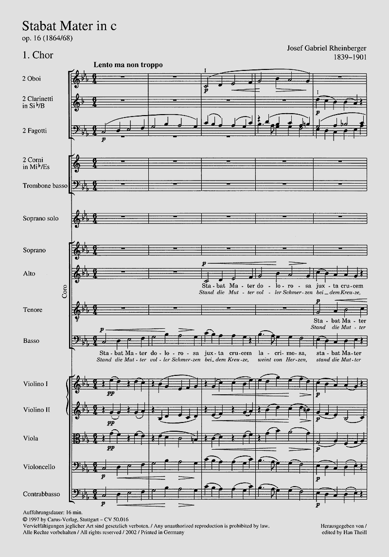 Die zeitgenössische Kritik sah in Rheinbergers 1864 entstandenem Stabat Mater op. 16 'eines der schönsten Werke, welches die neuere Zeit in dieser Richtung aufzuweisen hat. Ausgezeichnet durch breite Anlage und edle Klangwirkung reicht es in seiner reichen Polyphonie an die Meisterwerke der altitalienischen Schule.' In seinen expressiven Chorsätzen verbinden sich klangvolle homophone Passagen mit streng polyphon gearbeiteten Teilen. Von innigem Ausdruck sind die liedhaft gehaltenen Solostücke. Das ohne Flöten und Trompeten besetzte Orchester verleiht dem Werk seine charakteristische Klangfärbung. Soli STB, Coro SATB, 2 Ob, 2 Clt, 2 Fg, 2 Cor, Trb, 2 Vl, Va, Vc, Cb