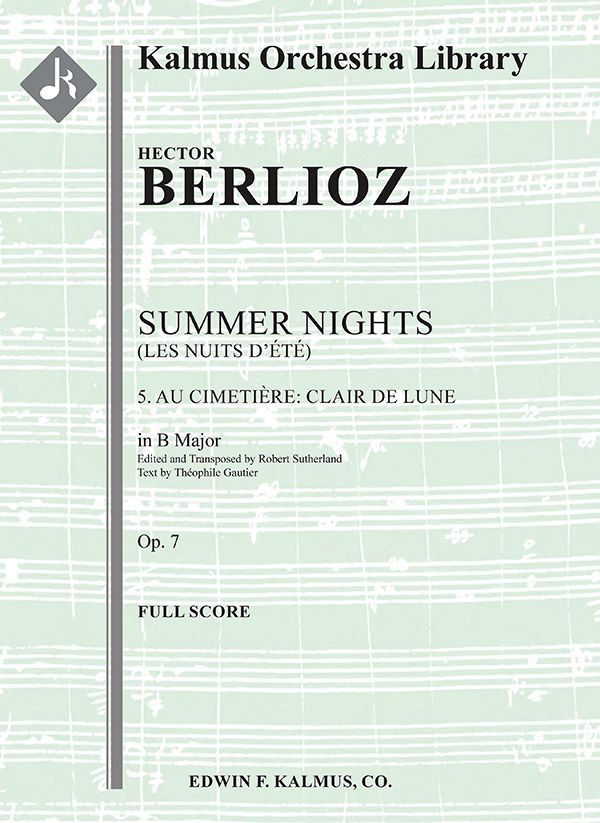 Der Liederzyklus LES NUITS D'ETE (SOMMERNÄCHTE) ist eine Vertonung von sechs Gedichten des Nachbarn und Freundes des Komponisten Hector Berlioz (1803-1869), Théophile Gautier. Der Text behandelt das Thema der Liebe in all ihren Facetten, von der jugendlichen Unschuld über den Verlust bis hin zur Erneuerung. Ursprünglich 1841 für Solosänger und Klavier komponiert, vollendete Berlioz 1856 die Orchestrierung aller sechs Lieder. Obwohl dieser Liederzyklus viele Jahre lang bedauerlicherweise vernachlässigt wurde, wurde er im 20. Jahrhundert wiederentdeckt und ist zu einem der beliebtesten Werke des Komponisten geworden. Die Lieder in den Originaltonarten (1. A; 2. B; 3. f-Moll; 4. fis; 5. D; 6. F) sind beim Verlag sowohl als Gesamtausgabe (A2573) als auch einzeln erhältlich. Robert Sutherland hat fünf der Lieder des Zyklus bearbeitet und jeweils in mehrere Tonarten transponiert, um das Werk für mehr Sängerinnen und Sänger zugänglich zu machen. Von Robert Sutherland ergänzte Lieder: 1. Villanelle (E, F und G), 4. Absence (Db, D, Eb und E), 5. Au Cimetière, Clair de lune (Bb, B und C) und 6. L'lle inconnue (D, Es und E). Eine Transposition von 2. Le Spectre de la rose nach D und eine Transposition von 3. Sur les Lagunes nach g-Moll ist ebenfalls beim Verlag erhältlich. Au Cimetière: Clair de lune (Auf dem Friedhof: Mondlicht) ist ein Klagelied nach dem Tod eines Geliebten, bei dem der trauernde Liebhaber den Friedhof besucht hat und von einer geisterhaften Vision des vergangenen Liebhabers gestört wird. Instrumentierung: 2.0.2.1: 0.0.0.0: Streicher (9-8-7-6-5 im Satz): Solostimme (mittlere Stimme). Neu gestochene Ausgabe.