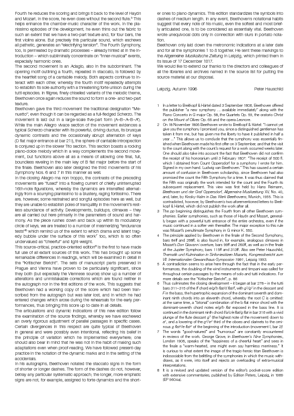 Wie bei den anderen Beethoven-Neuausgaben von Clive Brown und Peter Hauschild gleicht der Herausgeber auch bei der 4. Symphonie die in den Quellen häufig sehr unterschiedlichen Angaben nicht mechanisch an.