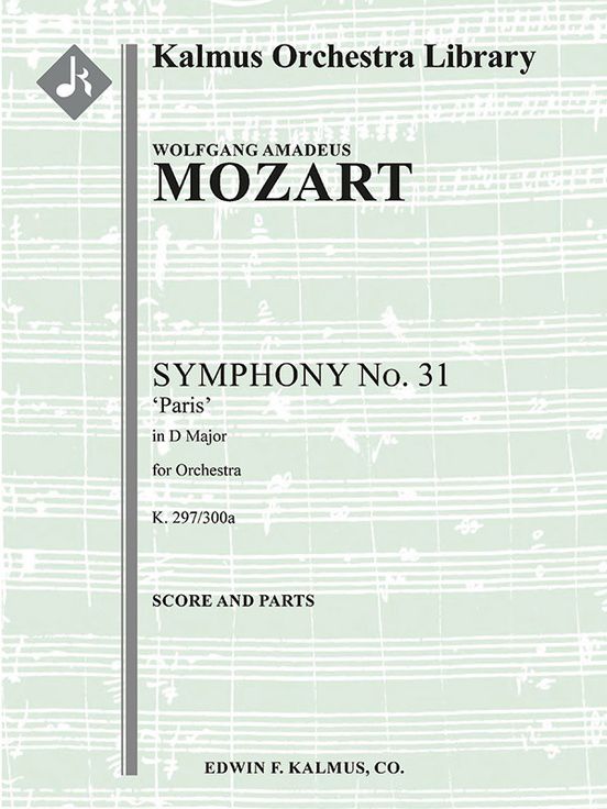 In 1778, Wolfgang Amadeus Mozart (1756-1791) charmed his way into the music scene in Paris with his Symphony No. 31 in D major, first performed on June 12 at the house of Count Sickingen by the Concert Spirituel. It follows a three-movement structure, which was preferred by his new audience, and absorbs the Parisian appetite for flamboyant style over melodic substance. Though the original slow movement (featured in this Kalmus edition) has found more popularity, Mozart wrote another one at the request of the director, Jean LeGros. In a letter to his father, Mozart declared that he felt more satisfied with the replacement, but that version is the less performed of this most famous symphony. Instrumentation: 2.2.2.2: 2.2.0.0: Timp: Str (4-4-3-3-3 in set).