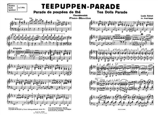 Tea Dolls' Parade or Teepuppen Parade is an example of the kind of dainty, light music that Bosworth published from 1936. Being jolly and melodic it is typical of pre-war music, including the innocent andendearing title.