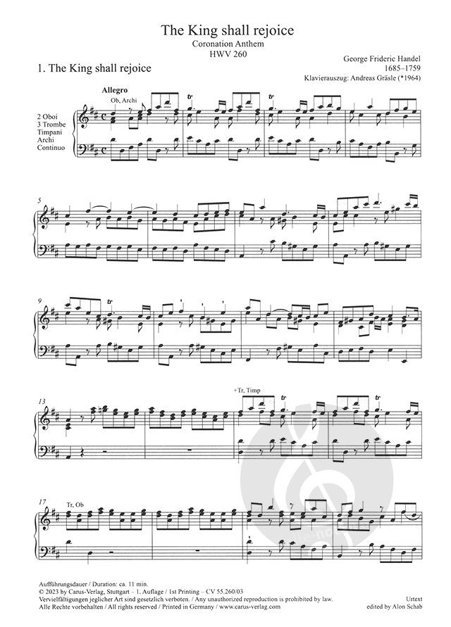 Für die Carus-Ausgabe der Anthems, erhältlich einzeln oder im Set, hat der Musikwissenschaftler, Komponist und Flötist Alon Schab die Originalquellen unter besonderer Berücksichtigung der spezifischen Gegebenheiten, die bei der Entstehung der Anthems eine Rolle gespielt haben, ausgewertet. Händels Chor im Jahr 1727 war ein dem feierlichen Anlass entsprechend großes Ensemble. Er setzte sich aus Sängern zweier Institutionen zusammen, die ein sechs- oder siebenstimmiges Ensemble bildeten, das für vier- oder fünfstimmige Abschnitte neu ausbalanciert werden musste.