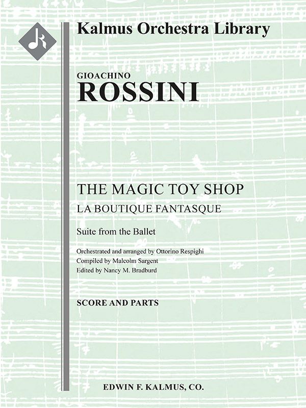 Die Musik für The Magic Toy Shop, ein Ballett in einem Akt über eine Liebesgeschichte zwischen zwei Can-Can-Tanzpuppen in einem Spielzeugladen, basiert auf Klavierstücken, die Teil von Rossinis Péchés de vieillesse waren. Respighi stellte Rossinis Partitur dem Impresario Sergei Diaghilev vor, dessen Ballets Russes das Ballett am 5. Juni 1919 in London vor einem gespannt wartenden Publikum uraufführten. Der britische Dirigent Malcolm Sargent übernahm die Orchestrierung von Respighi und stellte das Werk zu einer Suite zusammen, die Nancy Bradburd in dieser Ausgabe herausgegeben hat. Instrumentierung im Satz: 2+Picc.2+EH.2.2: 4.3.3.1: Timp.Perc(5) Hp.Clst: Str (9-8-7-6-5).
