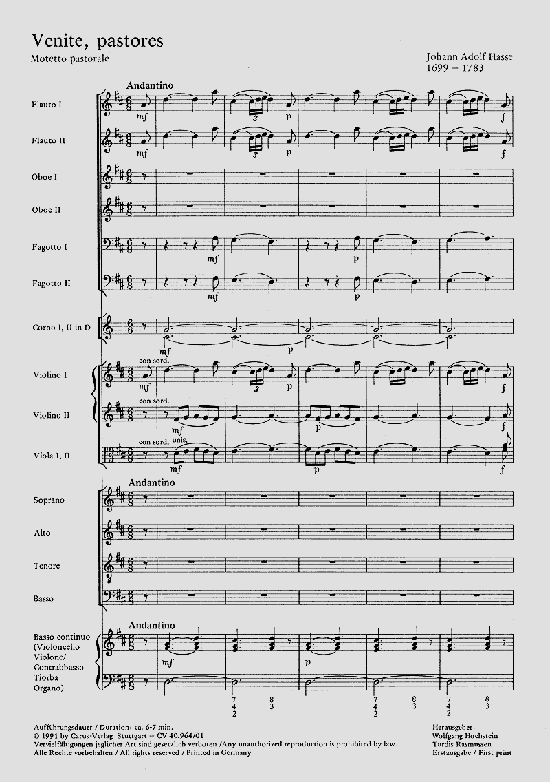 Motetto pastorale - Das kurze, wohlklingende Stück mit seiner reizvollen Instrumentierung erhält durch Orgelpunkte, Sicilianorhythmen und Terzparallelen in den Oberstimmen ein 'typisch weihnachtliches' Kolorit. Soli SAT, Coro SATB, 2 Fl, 2 Ob, 2 Fg, 2 Cor, 2 Vl, Va, Vc/Cb, Org