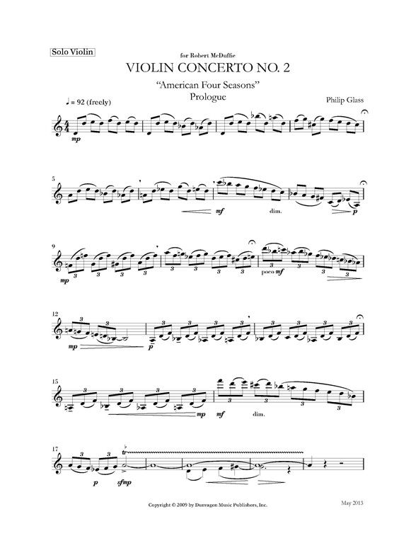 This is the Violin Solo Part of Philip Glass's wonderful Violin Concerto No. 2 'American Four Seasons'. The piece was commissioned by Toronto Symphony Orchestra and London Philharmonic Orchestra, among others, the world premiere was held in Toronto on December 9th 2009, conducted by Peter Oundjian. At this premiere, the violinist was Robert McDuffie, for whom the Concerto was composed. During the summer and autumn of 2009, Glass composed this work after many years of exchanges with McDuffie. His idea of creating a work that would be influenced by, and an accompaniment to Vivaldi's 'The Four Seasons'. Interestingly, Glass has provided no indication in the score of where each season falls, making it open for interpretation by the performers or the audience.