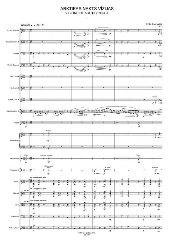Visions of Arctic: Night für Soloklarinette, Sinfonieorchester (bestehend aus einfachen Holzbläsern, dreifachen Blechbläsern, Schlagzeug, Klavier, Harfe und Streichern) und Elektronik ist Ešenvalds' Liepaja Concerto No. 4, welches er 2012 für das Liepaja Symphony Orchestra geschrieben hat. Das 25-minütige Klarinettenkonzert ist inspiriert von den Naturphänomenen und der Erhabenheit der baltischen Landschaft und des Nachthimmels. Es zeichnet sich durch eine ausgedehnte Tonalität und schillernde Klangfarben aus und macht sparsamen Gebrauch von Elektronik, um die räumliche Dimension der Klanglandschaft zu erweitern. Diese Partitur (EP73399) ist nun im Rahmen der Peters Baltic Library erhältlich. Peters Baltic Library ist eine neue Reihe mit Partituren von Orchestermusik zeitgenössischer Komponisten aus den baltischen Ländern. Veröffentlichung in Partnerschaft mit dem führenden Musikverlag der Region: Musica Baltica. Peters Baltic Library präsentiert eine umfangreiche Auswahl an Kompositionen, die sowohl die Besonderheit als auch die Vielfalt der stilistischen Ansätze der bedeutendsten Komponisten der Region demonstriert.