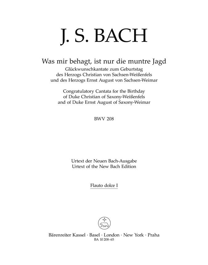 Jagd-(Glückwunsch-)Kantate, nach dem Urtext der Neuen Bach-Ausgabe. Sopran solo (2), Tenor solo, Bass solo, Gemischter Chor-SATB, Alt-Blockflöte in f,g (2), Oboe-dacc (2), Fagott, Corno da caccia (2), Streicher, Basso continuo