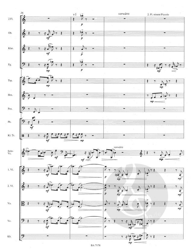 Besetzung: 2 (2. auch Picc), 1, 1, 1 - 1, 1, 1, 1 - Pk, Schlg (2) - Klav - Str (empfohlen: 8, 7, 6, 5, 3)/ca. 20 Minuten