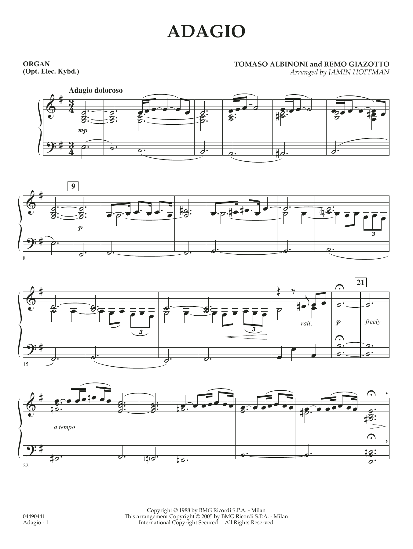 The beloved Adagio from Albinoni has long been a concert favorite everywhere. Jamin Hoffman's new version is set in E minor and arranged to fit the musical and technical levels of today's string orchestras. It includes a keyboard part that can be played on organ (as the original), and solo violin, appropriately arranged to feature your best soloist.