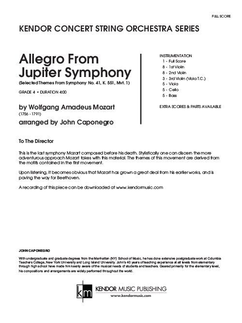 This grade 4 arrangement contains selected themes from the 1st Movement of Symphony No. 41, K. 551. This was Wolfgang Amadeus Mozart's last symphony composed before his death, and clearly shows his brilliance as a composer. Mozart's adventurous approach to the material paves the way for Beethoven. Each set includes three copies of the 3rd Violin/Viola T.C. piano part. Duration 4:00.