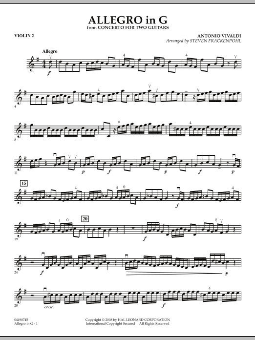 This lively movement is adapted from Vivaldi's Concerto for Two Guitars, carefully crafted for string ensemble by Steven Frackenpohl. In true Vivaldi style, the ensemble is driven by energetic rhythms that make all parts interesting and fun to play. Another outstanding edition for young string orchestra teaching and performance.