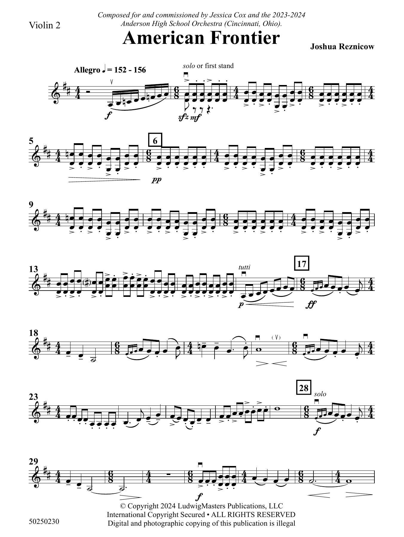 American Frontier for string orchestra was written by Joshua Reznicow utilizing various ensemble configurations from within the string orchestra. Solo lines, quartet, quintet, and sectional soli all help to make up the overall design and orchestral colors of the piece. As a juxtaposition to this, large divisi string writing is utilized to help balance the smaller ensemble writing within the score. The work is inspired by images of a western frontier---one filled with large fields, mountains, and sunsets, as well as subtle character-filled details that have a forward and fast-moving feel. (5:00)