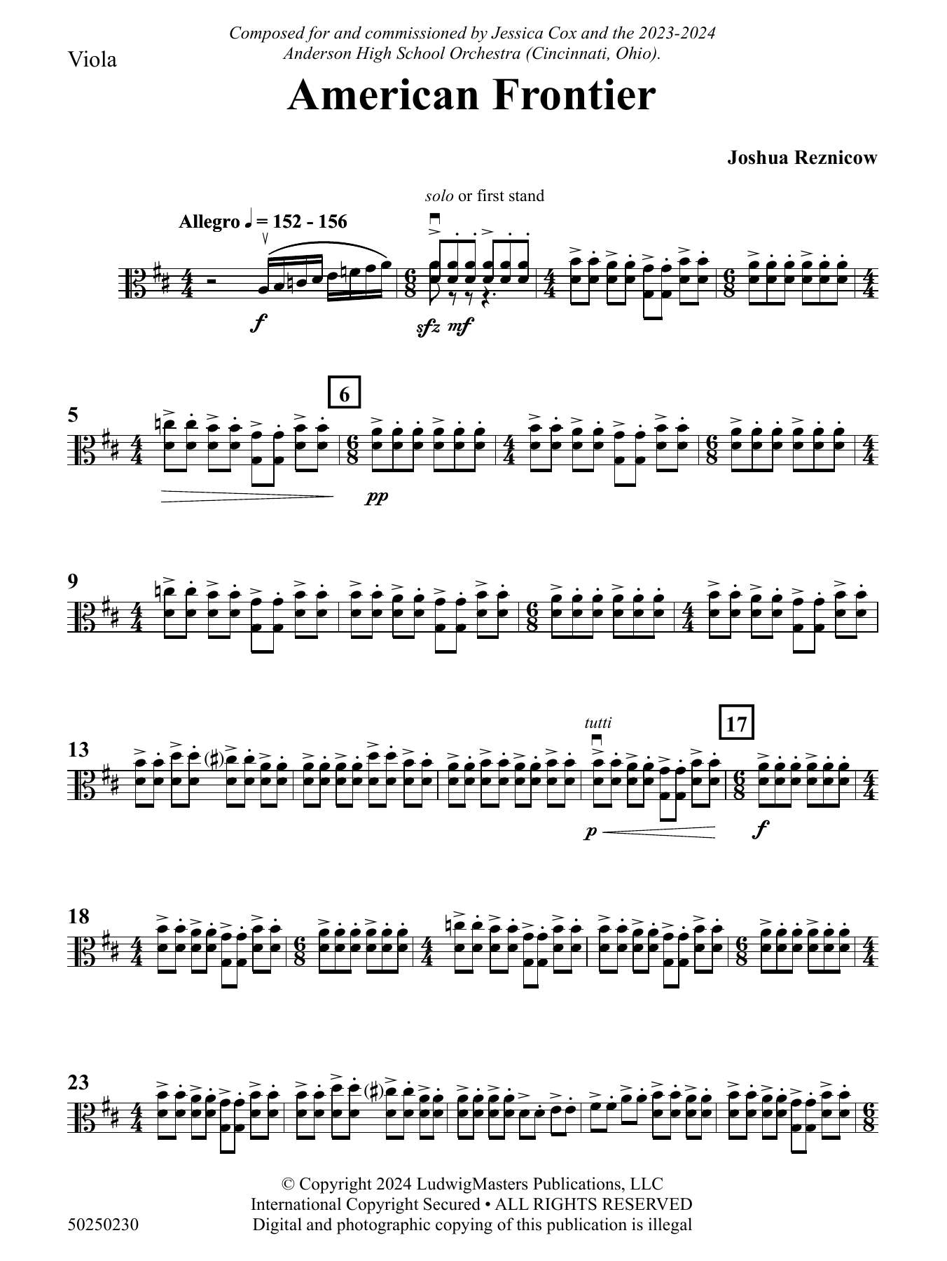 American Frontier for string orchestra was written by Joshua Reznicow utilizing various ensemble configurations from within the string orchestra. Solo lines, quartet, quintet, and sectional soli all help to make up the overall design and orchestral colors of the piece. As a juxtaposition to this, large divisi string writing is utilized to help balance the smaller ensemble writing within the score. The work is inspired by images of a western frontier---one filled with large fields, mountains, and sunsets, as well as subtle character-filled details that have a forward and fast-moving feel. (5:00)