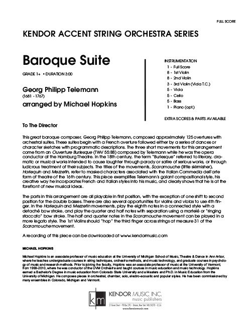 Introduce your students to the gallant style of Georg Philipp Telemann with this grade 1+ arrangement. This is an excellent piece to develop bowing technique, dynamic contrasts, phrasing and tempo changes. Each set includes three copies of the 3rd Violin/Viola T.C. and piano parts. Duration 3:00.