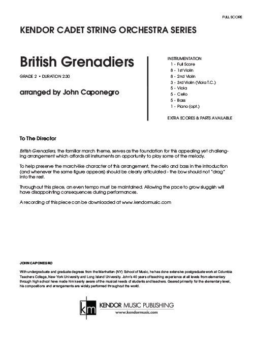 Opening with a cello and bass introduction, this adaptation of the popular march theme demands a steady tempo, clearly-articulated bowings, and careful attention to accents and dynamics. It affords all instruments a chance to carry some melodic material, and is scored in G and D to minimize key-related difficulties for student groups. Duration 2:30.