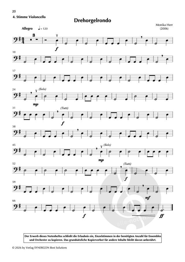Der Titel des vorliegenden Stückes Drehorgelrondo, bezieht sich auf den immer wiederkehrende Bordun der vierten Stimme, der an Drehorgelmusik erinnert, wie sie hin und wieder auf Jahrmärkten anzutreffen ist. Diese ostinate Bordunstimme kann vollständig auf leeren Saiten gespielt werden und bietet somit auch Orchesterneulingen eine schöne und gut bewältigbare Aufgabe bei ihrem ersten Auftritt.