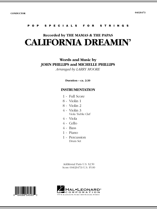 This pop music classic by the Mamas and the Papas was selected as one of the best songs of all time by Rolling Stone magazine. Recently recorded by Queen Latifah, its melodic hooks and distinctive harmonic progression give it timeless appeal in this new edition for string orchestra.