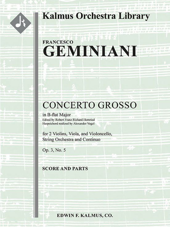 While Italian Baroque composer and violinist Francesco Xaverio Geminiani (1687-1762) has now largely been forgotten, during his lifetime he was considered on the same tier as Handel or Corelli, whose contrapuntal style he emulated. Compositionally, he is best known for three sets of 42 concerti grossi (a term made famous by Corelli): Opus 2 (1732), Opus 3 (1733) and Opus 7 (1746). These were written for an English audience excited by the 'Corellian' style, despite the rest of Europe then adopting the fashionable galant style. These concerti grossi proved very popular on performance and were published quickly in London. The collection of Six Concertos (Concerti Grossi), Op. 3 were written first in 1732-1733, but were revised by Geminiani in 1755. This edition of Concerto Grosso in B-flat, Op. 3, No. 5 has been edited by Robert Hernreid, and it features combined ripieno and concertante string parts (4-4-3-3-3 in the set) into each instrument part and a realized cembalo/harpsichord continuo by Alexander Vogel. Reprint edition.