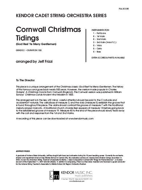 This creative grade 2 interpretation of the great Christmas favorite God Rest Ye Merry Gentlemen will be the highlight of your next holiday concert. Scored in E minor, a traditional version of the melody played by upper strings is supported throughout by a trendy groove in the cello/bass parts. As explained in the score notes, the title of this setting refers to the fact that the carol on which it is based hails historically from the Cornwall region of England. Three copies of the 3rd Violin/Viola T.C. part are included in each set. Duration 1:50. Available in SmartMusic.