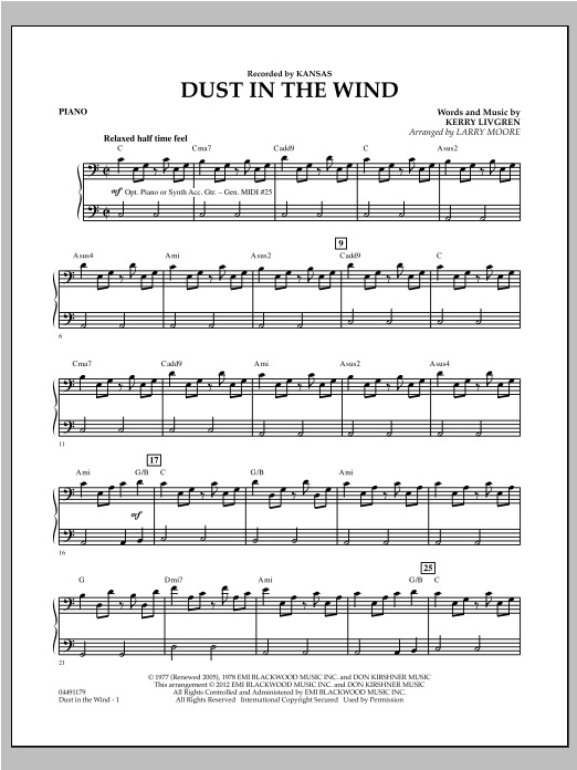 Here's a rare opportunity to feature an acoustic guitar soloist with the famous signature song of the band Kansas - a great chance to include a budding rock star with your string orchestra. Larry Moore's skilled arrangement can be performed with or without guitar.