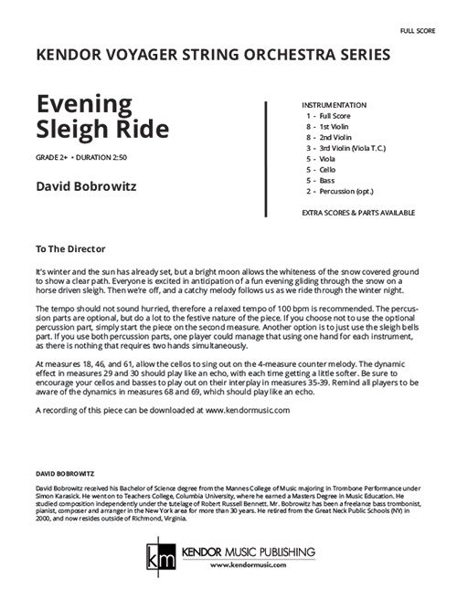 It's winter and the sun has already set, but a bright moon allows the whiteness of the snow covered ground to show a clear path. Everyone is excited in anticipation of a fun evening gliding through the snow on a horse driven sleigh. Then we're off, and a catchy melody follows us as we ride through the winter night. Each set includes three copies of the optional 3rd Violin/Viola T.C., and percussion parts. Duration 2:50. Available in SmartMusic