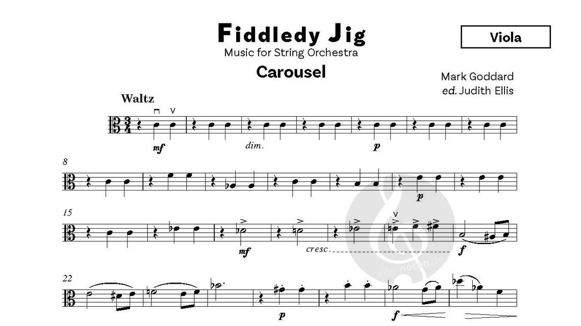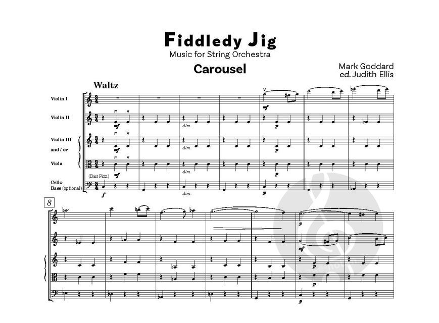 Fiddledy Jig ist eine fesselnde Suite von vier tanzähnlichen Stücken für Schülerstreichorchester. Die Musik, die erstmals 1992 von Spartan Press veröffentlicht wurde, nutzt vertraute musikalische Genres mit großer Wirkung und verwendet Pizzicato, Arco, Tutti, Solo, D.C. al Fine sowie ein gelegentliches Glissando! Die Bratschen können durch die Violine III ergänzt oder ersetzt werden. Ungefähr für die Klassen 4 - 6. Der gedruckte Satz enthält eine Partitur und einen vollständigen Satz Stimmen wie folgt: 3xvln1, 2xvln2, vln3/va, 2xvc, db.
