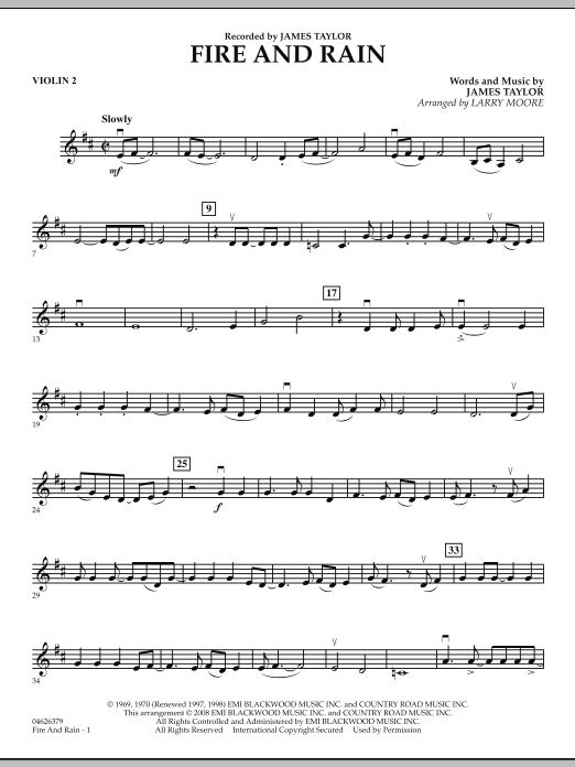 A classic song from one of popular music's most revered artists is now available for string groups with this superb arrangement by Larry Moore. James Taylor's Fire and Rain has become a trademark of his simple, enduring style that communicates so well with its listener.