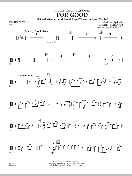 The musical Wicked continues its phenomenal run, placing it clearly in the upper ranks of Broadway successes. This memorable duet between characters Glinda and Elphaba is transformed into a dramatic moment for string orchestras. Jim's flexible format allows you to feature either two violins or a violin and viola. The ensemble accompaniment can also be used with two vocalists.