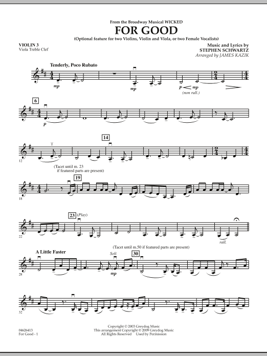The musical Wicked continues its phenomenal run, placing it clearly in the upper ranks of Broadway successes. This memorable duet between characters Glinda and Elphaba is transformed into a dramatic moment for string orchestras. Jim's flexible format allows you to feature either two violins or a violin and viola. The ensemble accompaniment can also be used with two vocalists.