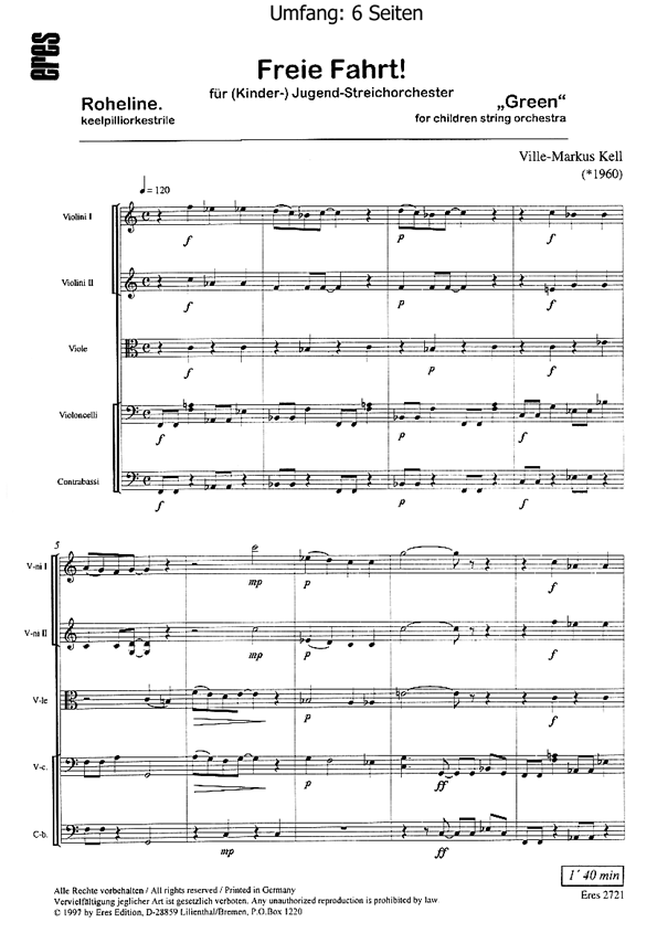 Freie Fahrt! PartiturEin leichtes Stück für Streichorchester (2.1.1.1). Estnischer Originaltitel 'Roheline' / Englischer Titel: 'Green'.Auff.-Dauer: 1'40 min.ááStimmen sind unter eres 2721.1 lieferbarEres Estonia Editionááá